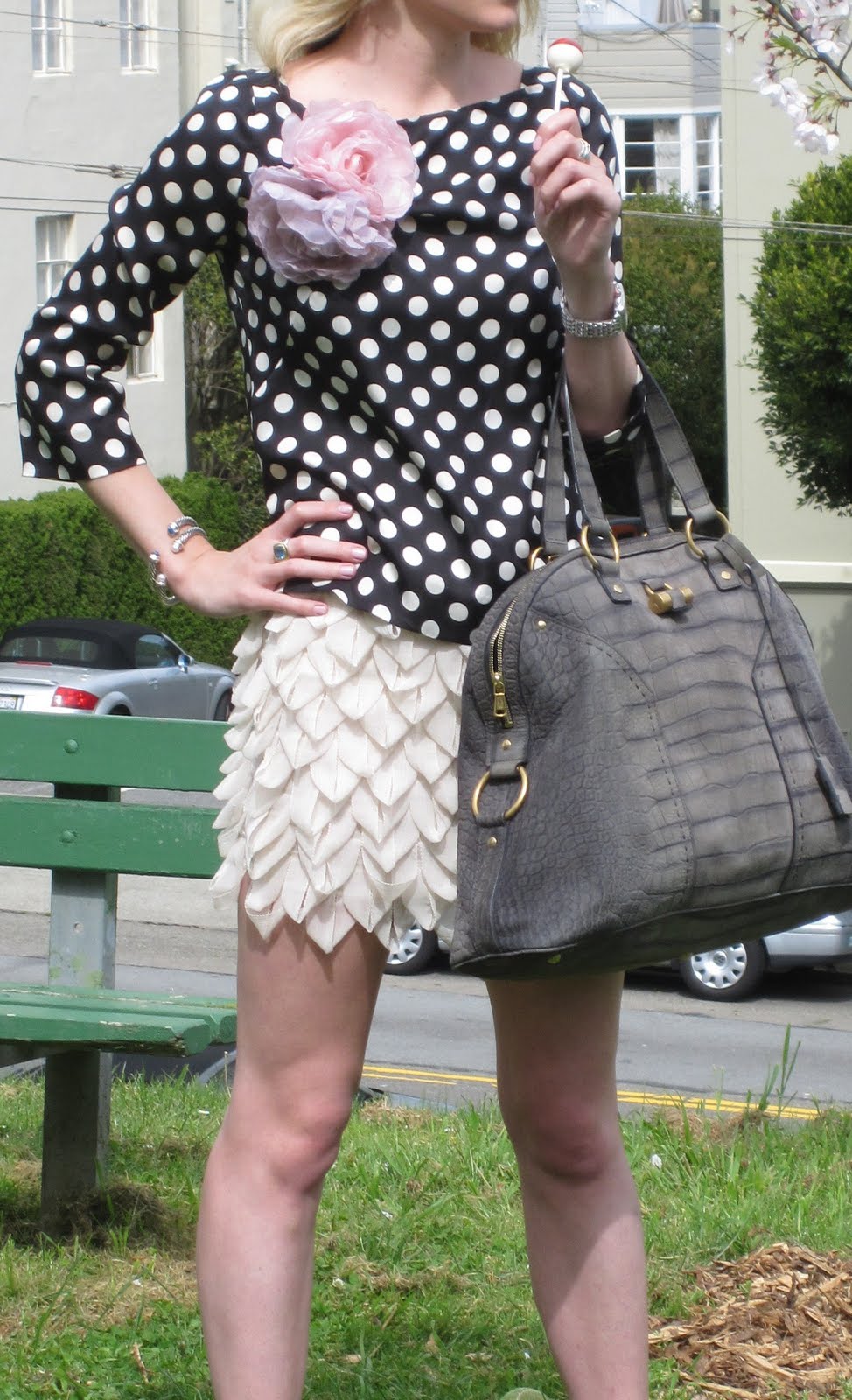 April 19, 2010 Sweetness Top: Jcrew. Skirt: ASOS. Shoes: Dolce Vita. Bag: YSL Oversized Muse. Flower Pins: H&M. Watch: Michele. Jewelry: DY, Kate Spade.
