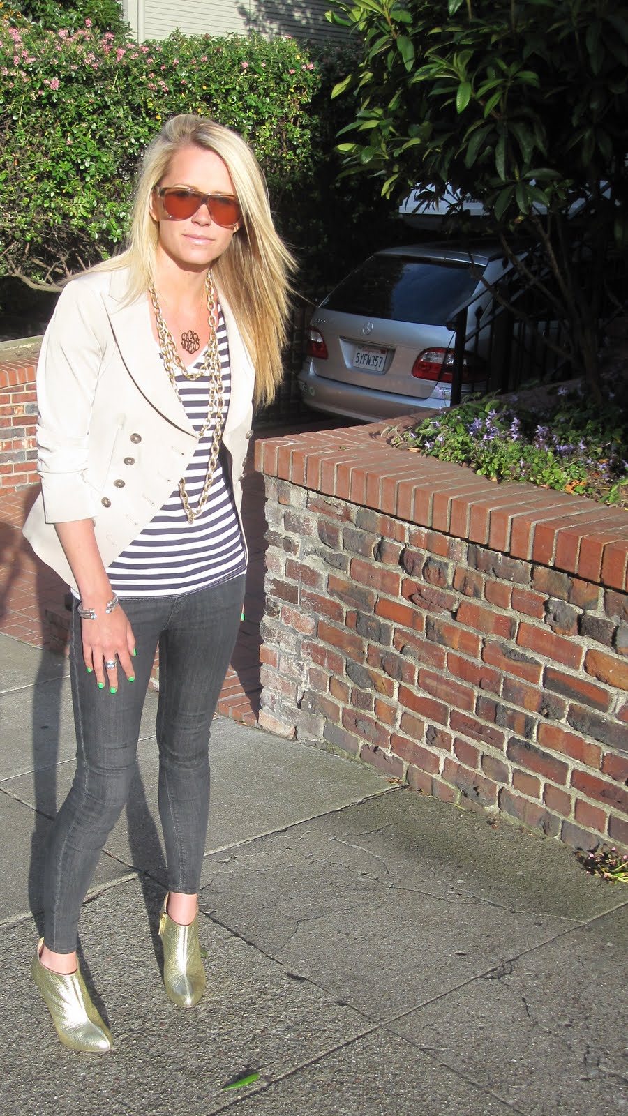 June 16, 2010 Sailor Stripes Shirt: H&M. Jacket: Elizabeth&James. Jeans: BDG. Shoes: Giuseppe Zanotti. Sunglasses: YSL. Jewelry: David Yurman, Saks5th, Chloe&Max, GAP, BR, Michael Kors. Load More Subscribe Exclusive content & weekly updates Scroll Up