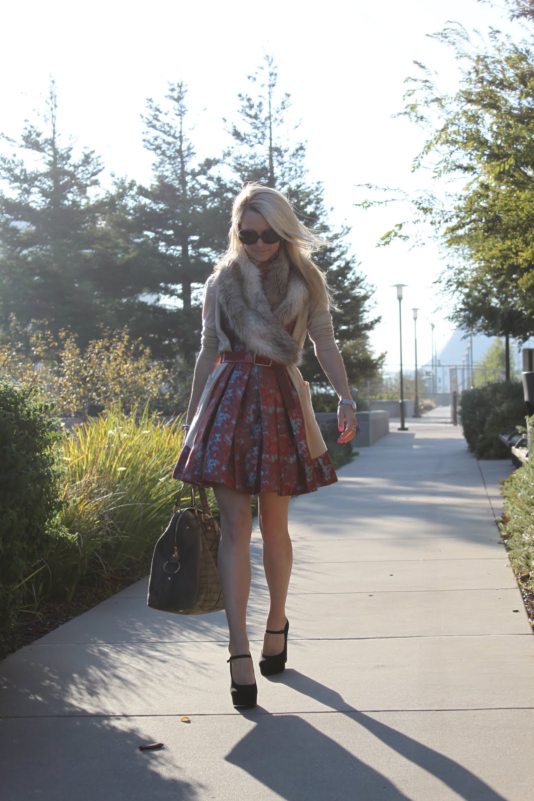 Dress: Modcloth. Cardigan: Banana Republic Monogram. Fur Stole: H&M. Shoes: Forever 21. Bag: YSL. Sunglasses: RL Collection. Jewelry: David Yurman, Michele.