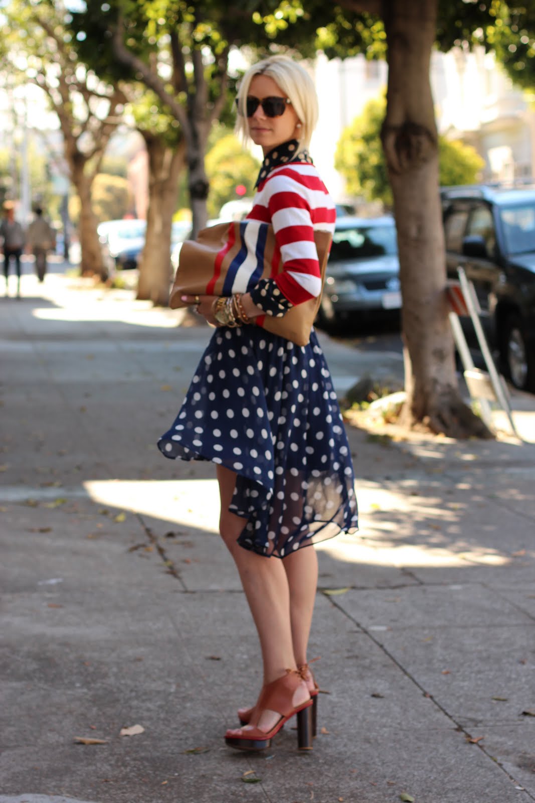 Sweater: Zara. Polka Dot Top: Equipment. Skirt: c/o Ruche. Bag: DIY American Apparel Clutch. Sunglasses: Karen Walker Deep Freeze. Shoes: Pour La Victoire. Jewelry: YSL Ring, David Yurman (bracelet c/o), Michael Kors, Jcrew, Pomellato. Nails: Butter London ‘Teddy Girl’.