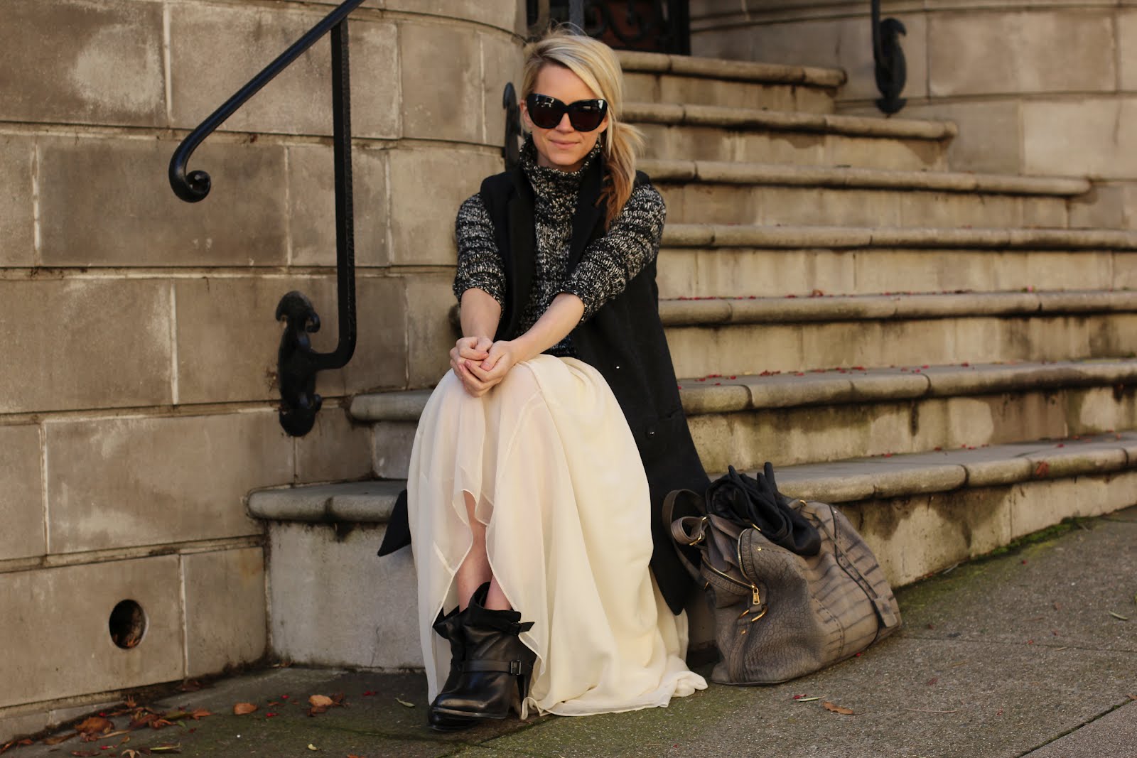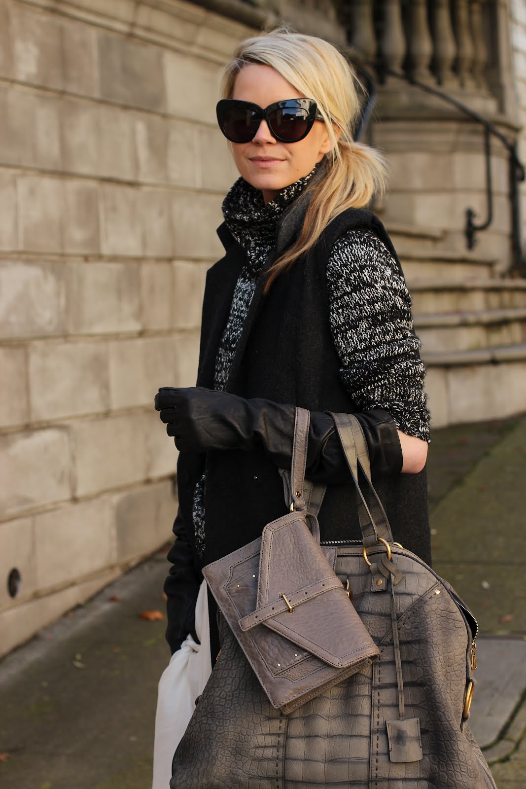 Dress worn as skirt: ADAM. Sweater: Zara. Vest: H&M. Shoes: Givenchy (old). Sunglasses: House of Harlow. Purse: YSL. Clutch: Tory Burch (last seen here). Gloves: All Saints.