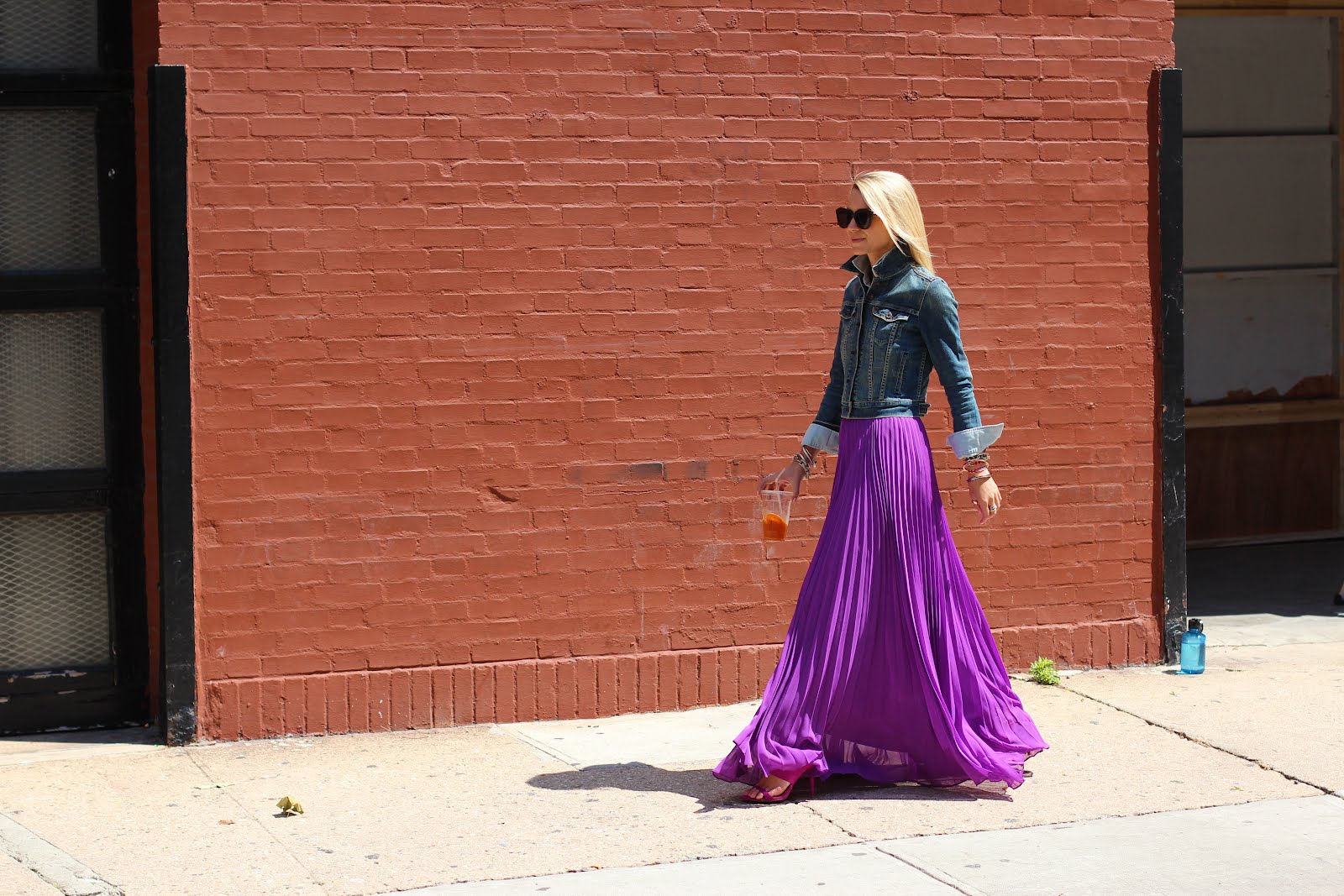 Jacket: Levi’s. Chambray Shirt: Jcrew Factory Dress. Skirt: Alice + Olivia last seen here (similar here and here). Shoes: Zara (old). Purse: thanks to Rebecca Minkoff. Sunglasses: Karen Walker. Jewels: YSL, Jcrew, Anthro, GAP.