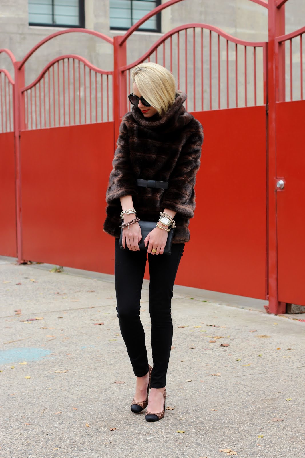 Faux Fur Pullover: Kate Spade (old). Jeans: JBrand. Shoes: Ann Taylor c/o. Sunglasses: Karen Walker ‘Super Duper’. Clutch: Ann Taylor c/o (last seen here). Nails: Essie ‘Little Brown Dress’. Jewelry: Michele, Stella and Dot. Black/Brown Chain Link Bracelet: Styleliner (you can check out their schedule here). Bow Belt: Ann Taylor c/o.