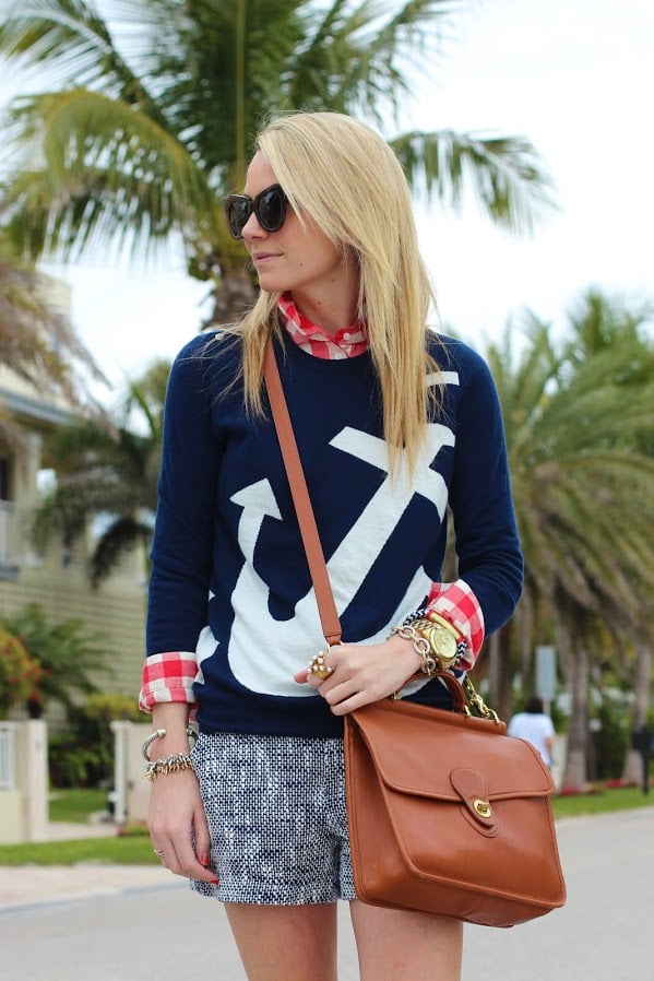 Sweater: Joie c/o. Gingham Shirt: Madewell (old). Shoes: Banana Republic (old). Shorts: Joie c/o. Purse: Coach. Sunglasses: Karen Walker. Jewelry: Michael Kors Watch, Stella and Dot, David Yurman, The Ropes.
