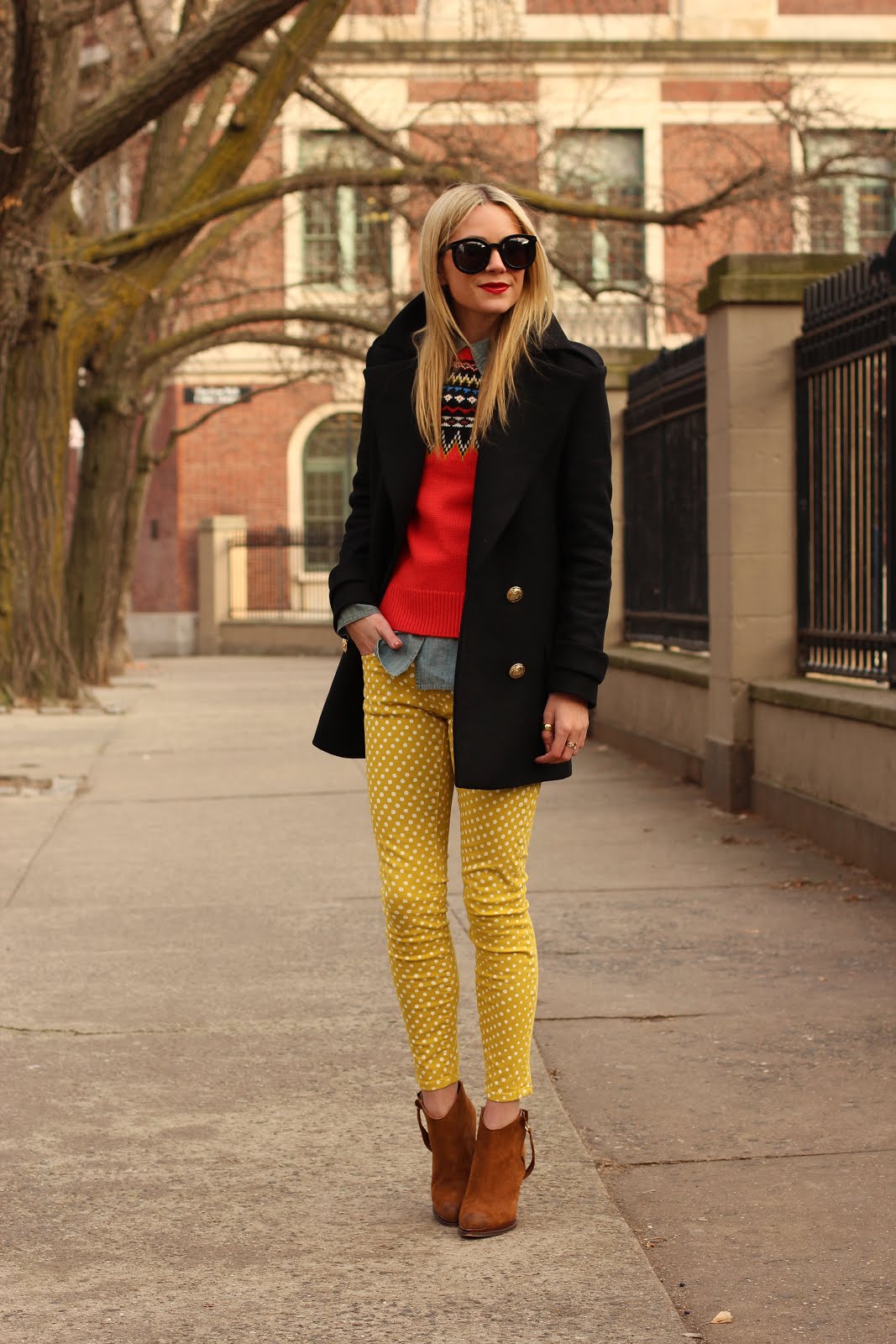 Sweater: Jcrew (similar here). Denim: Current/Elliott. Chambray: Gap (similar here). Shoes: Zara (similar here). Jacket: Zara. Sunglasses: Karen Walker. Rings: Stella and Dot, Pomellato, David Yurman.