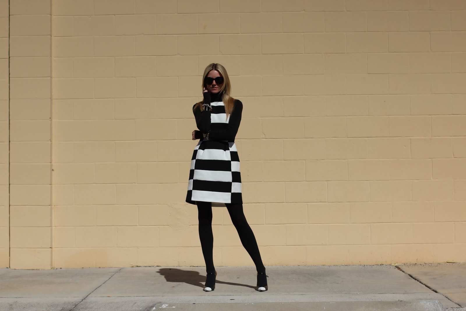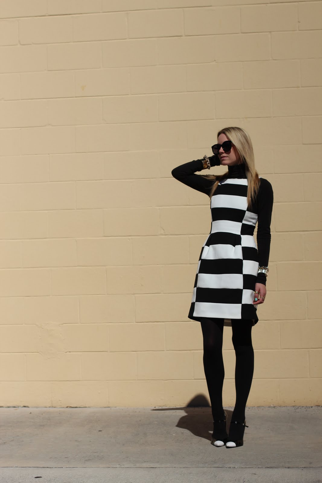 Jacket: Club Monaco. Dress: Bebe (similar here). Turtleneck: Martin and Osa (similar here). Tights: Club Monaco. Shoes: Stuart Weitzman. Nails: POP ‘Mint Magic’. Jewelry: Michele Watch, David Yurman, Pomallato, Hermes. Sunglasses: Karen Walker ‘Super Duper’.