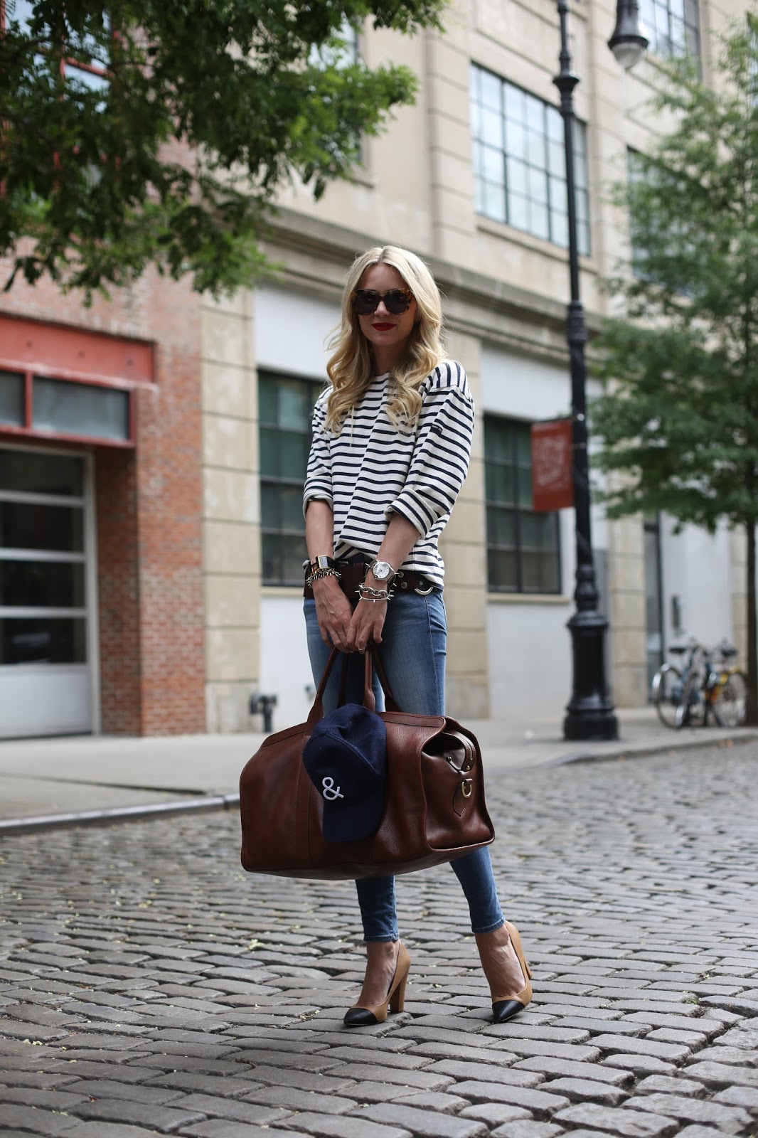 Top: Saint James (old, similar here). Jeans: Rebecca Minkoff. Shoes: Zara. Belt: RL (old). Bag: Frank Clegg. Hat: Gap (old but love this one). Sunglasses: Karen Walker ‘Number One’. Lips: Stila ‘Beso’. Jewelry: Cartier Watch, David Yurman, Pomellato, Hermes, Stella and Dot.
