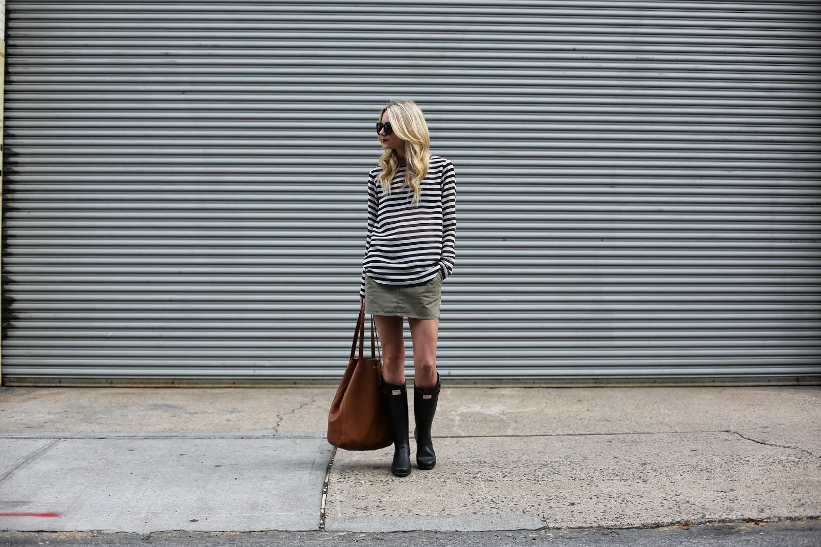 October 11, 2013 right before the rain Top: Ann Taylor c/o. Skirt: Denim and Supply (old). Bag: Cuyana Tall Tote. Boots: Hunter X Rag and Bone. Sunglasses: Karen Walker ‘Super Duper’. Lips: Stila ‘Beso’.