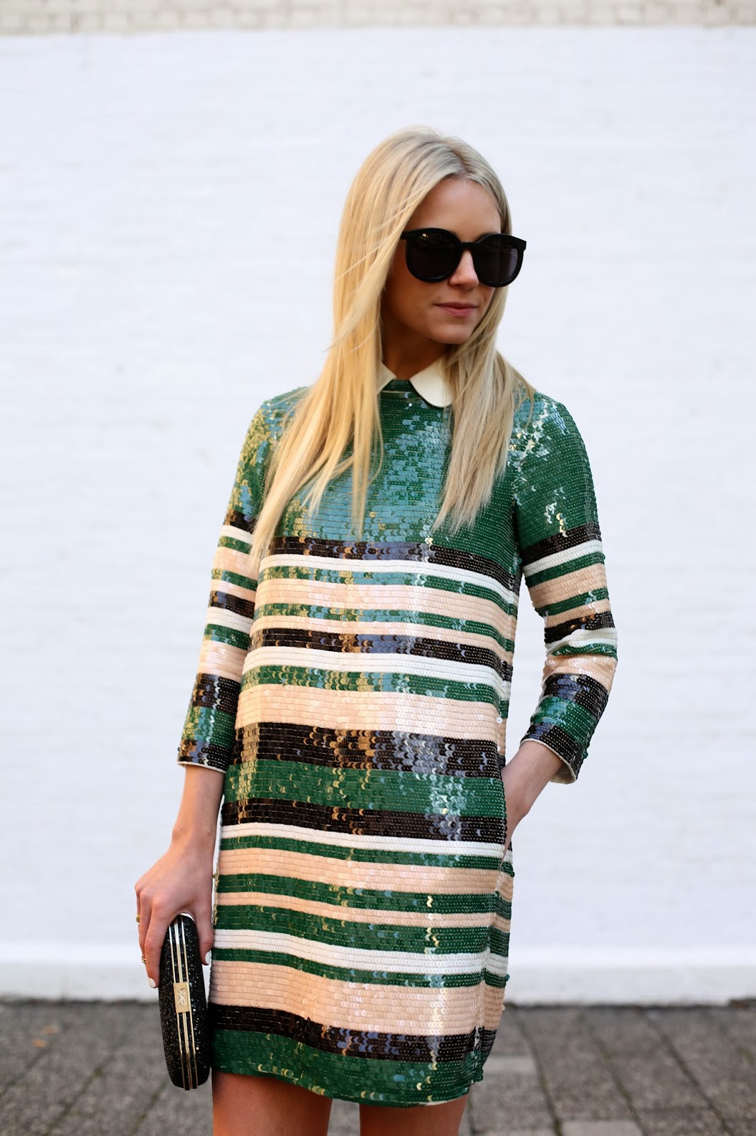 Dress: ASOS (also love this one and this one). Shoes: Valentino. Collar: From a Milly Sweater (similar here). Minaudiere: Anya Hindmarch. Sunglasses: Karen Walker ‘Super Duper’. Nails: Deborah Lippmann ‘Amazing Grace’. Rings: Cartier, BaubleBar.
