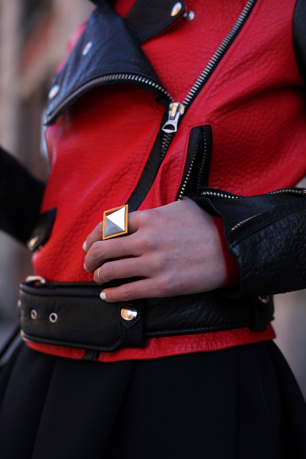 Jacket: Acne. Dress: Tibi. Turtleneck: Zara. Shoes: Trina Turk c/o. Tights: Hue. Lips: Stila ‘Beso’. Sunglasses: Karen Walker ‘Super Duper’. Nails: Deborah Lippmann ‘Amazing Grace’. Ring: Trina Turk c/o. Bag: Mansur Gavriel.