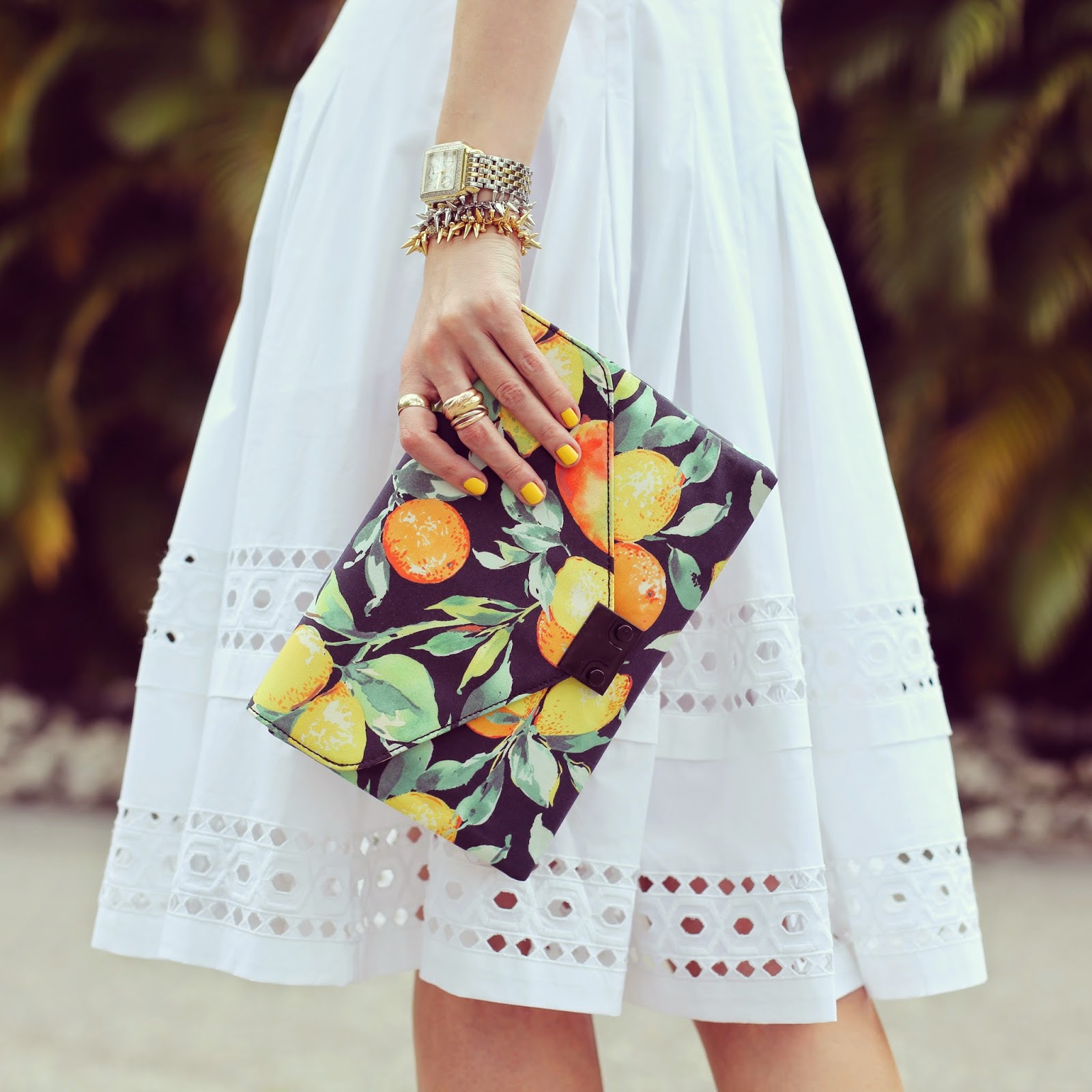 Clutch: Loeffler Randall (also here). Dress: Catherine Malandrino. Nails: Deborah Lippmann ‘Walking on Sunshine’. Watch: Michele. Jewelry: Stella and Dot, Cartier.