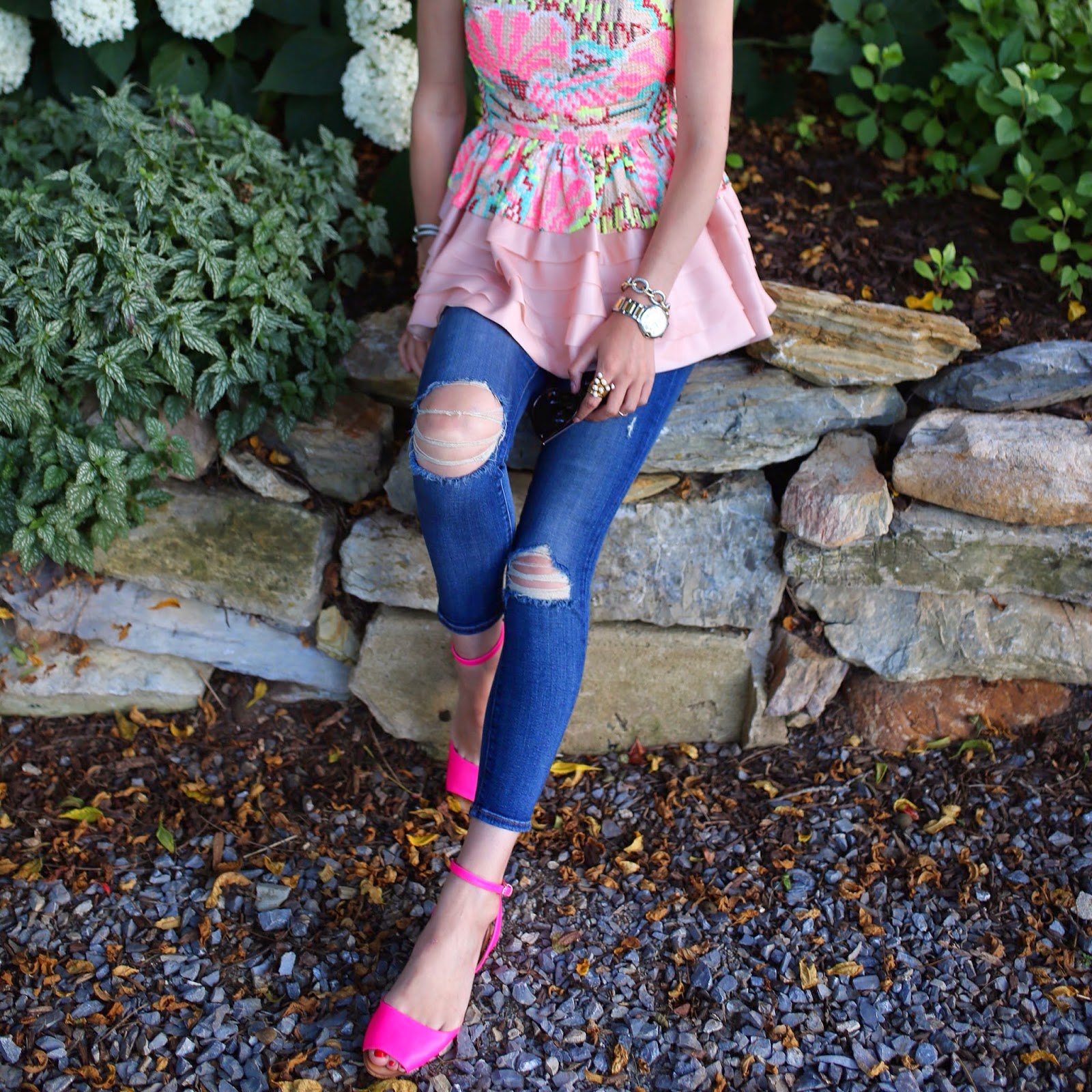 Top: Anthropologie. Denim: J Brand. Shoes: Zara (similar here). Bracelets: David Yurman. Watch: Cartier. Sunglasses: Prada.