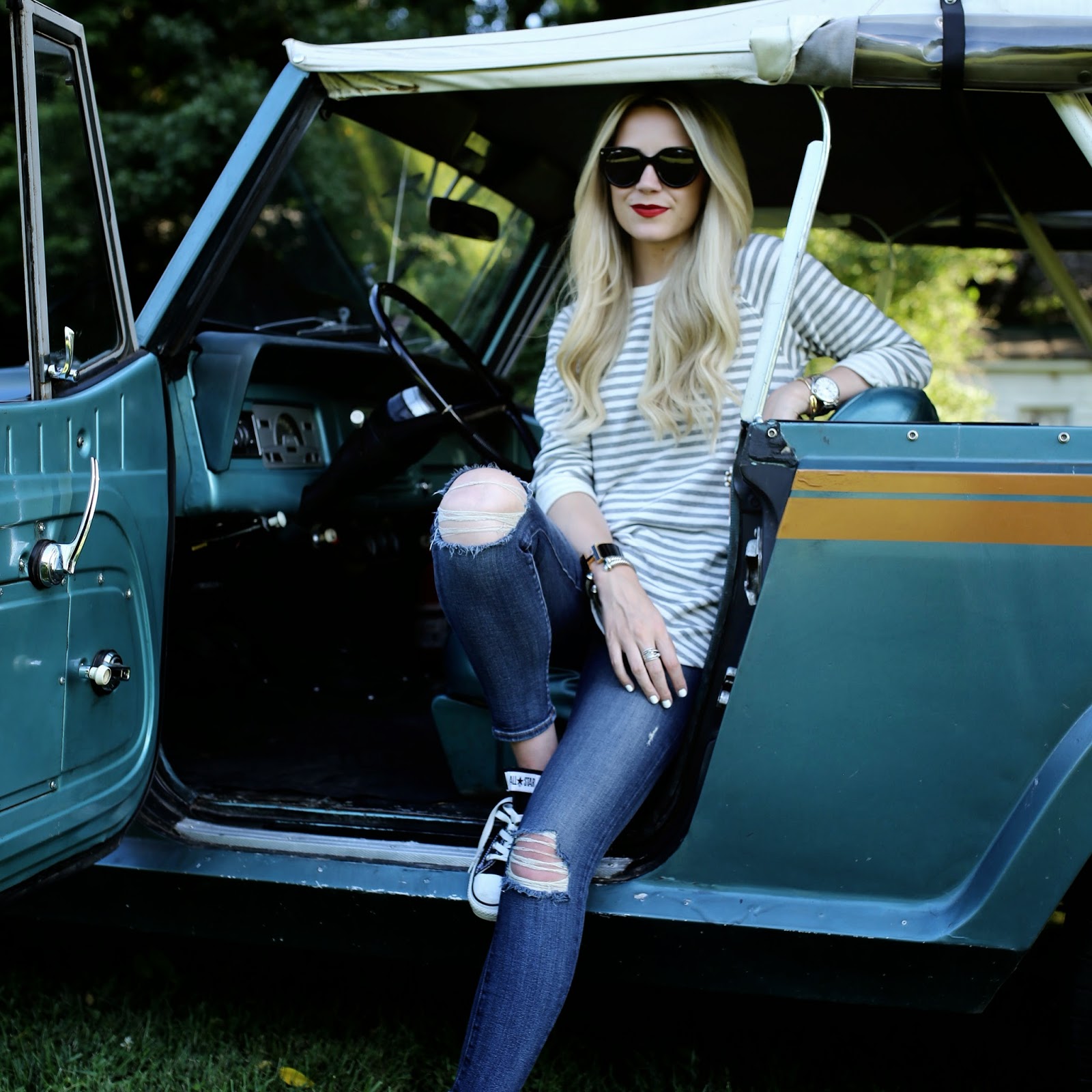 Top: Topshop. Denim: J Brand. Shoes: Converse. Sunglasses: Prada. Lips: Stila ‘Beso’.