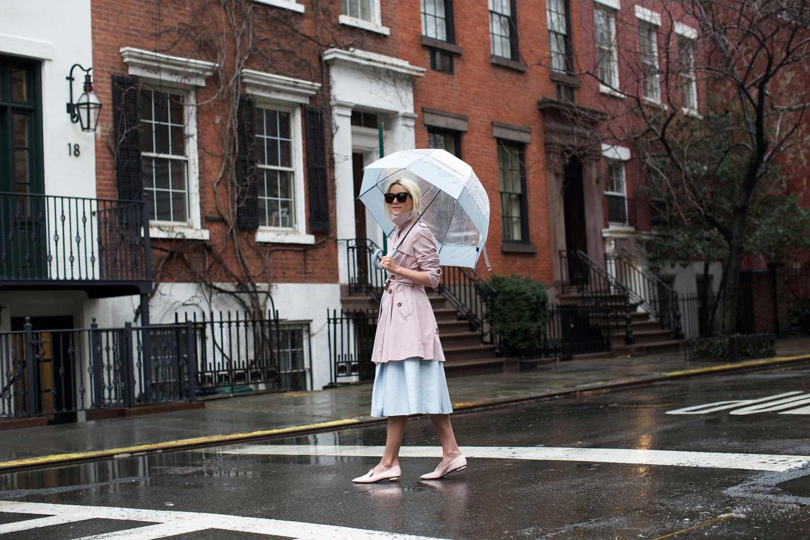 Blush Trench. Bow Dress (also in 2 other colors here). Umbrella: Hunter (also here). Flats: Nicholas Kirkwood (in 7 other colors, also love the red). Sunglasses: Celine. Bag: Strathberryc/o.