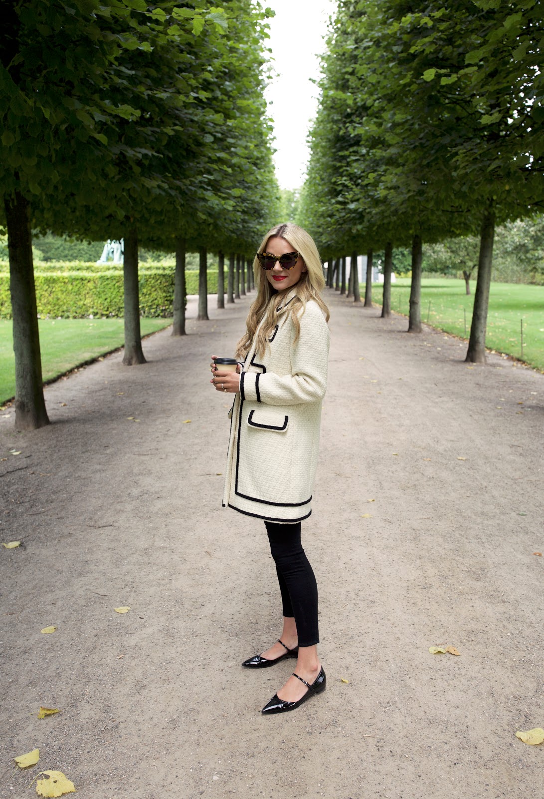 Coat: Moschino. Denim: L’agence. Shoes: Prada (similar). Sunglasses: Karen Walker. Bag: Chanel. Lips: Stila.