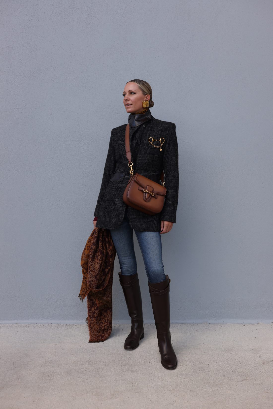 I’m loving the current equestrian trend, and one of my favorite ways to wear it is by pairing riding boots with skinny jeans, a turtleneck or button-down, and a tailored blazer. You can tuck straight-leg denim into riding boots, but that look just isn’t for me—I prefer a cleaner, tighter silhouette.