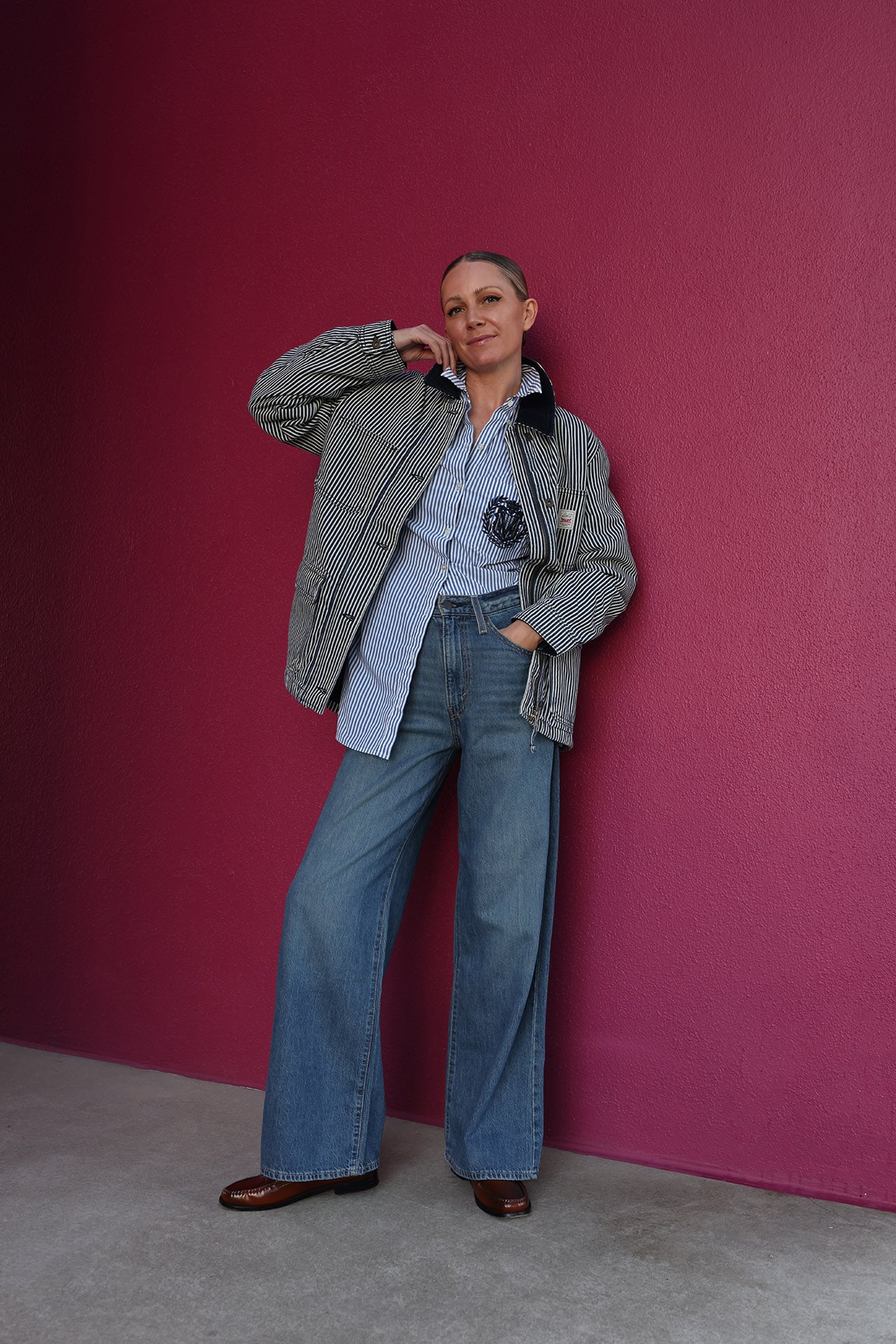 The drape of this denim is incredible. It feels like you are wearing PJs – yet you are wearing an effortlessly chic pair of denim. This is a higher rise with a wide leg and I am wearing the ‘chasing dreams medium wash‘. I opted to pair these with flats but I could absolutely wear there with a low heel. This fit would also look great with a sneaker! Also don’t sleep on the great tops, jackets, and sweaters Levi’s has this season. This jacket I am wearing here is my personal favorite.