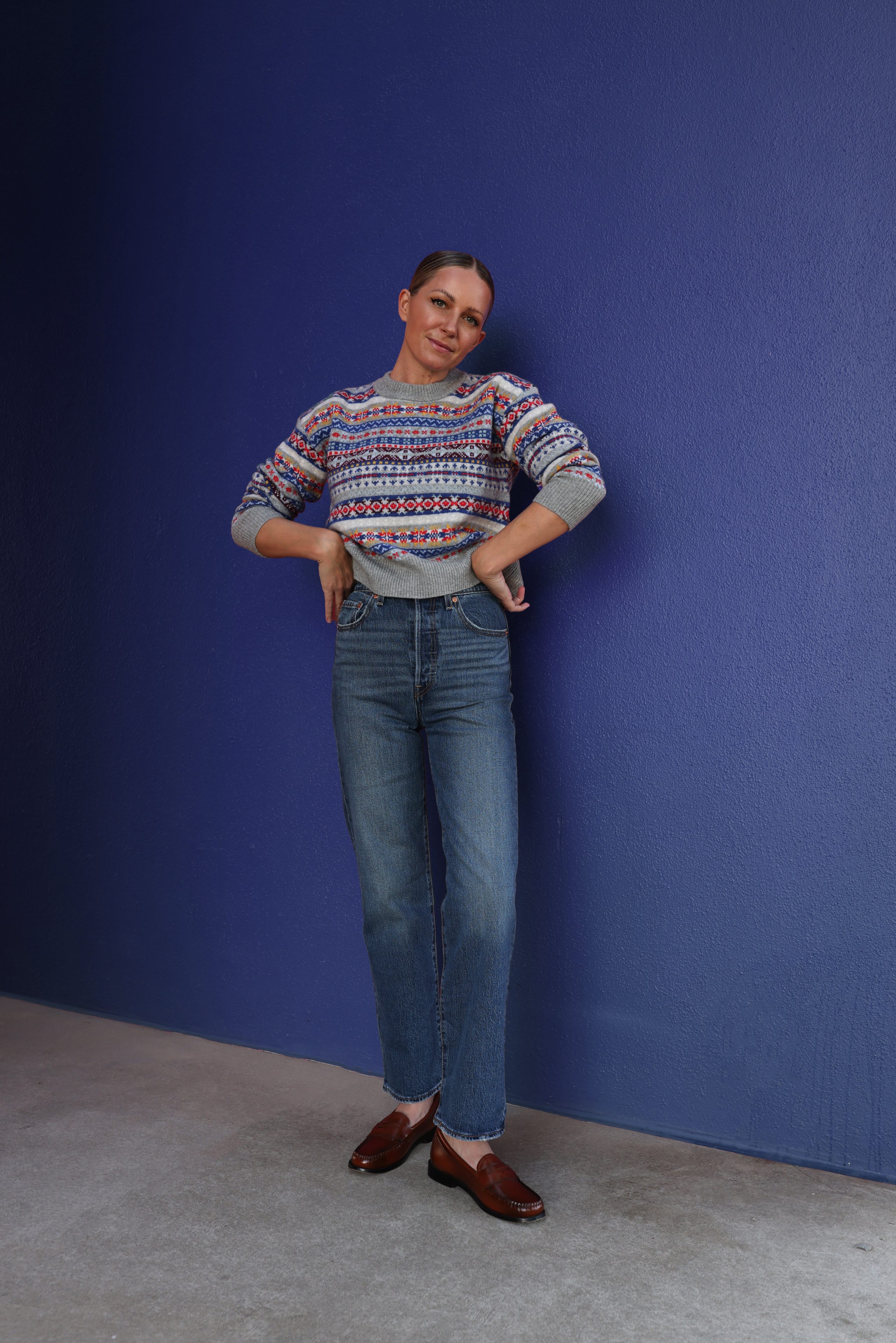 If you know me you know that I love a good ankle length. The ankle length allows you to show a little skin, and in my opinion, allows for the most versatile shoe styling. This pair looks great with a preppy loafer, but would look equally as put together with a classic pair of stilettos, strappy sandals, platforms, or a ballet flat. This denim has the highest rise of all the jeans I am highlighting today and unlike the other two options, this one is very fitted through the waist and hips. I am wearing the ‘on my honor dark wash’ and paired it with this funky fairisle sweater!