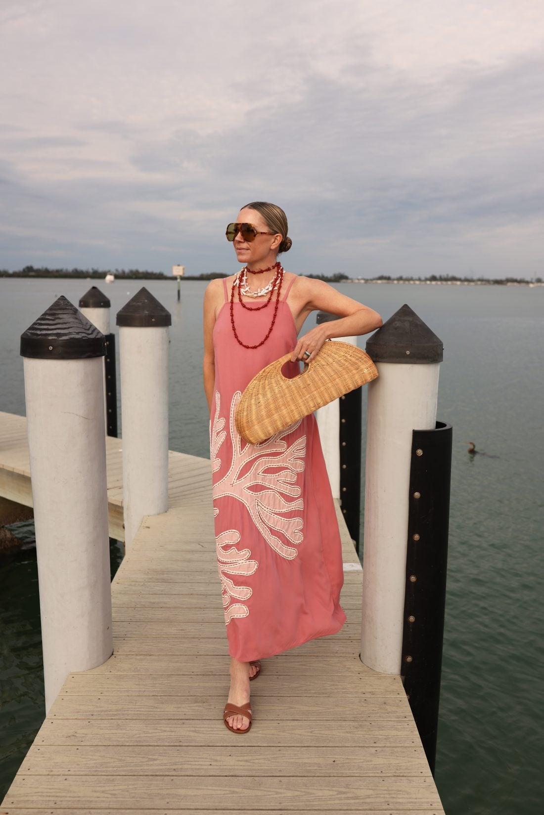 Last but certainly not least is this easy maxi dress. This dress has a stunning coral applique pattern that is applied with a thick topstitch. If coral is something you gravitate towards, I am also very smitten with this shorter cover up. I paired the maxi with this long necklace and two coral necklaces I picked up last year!